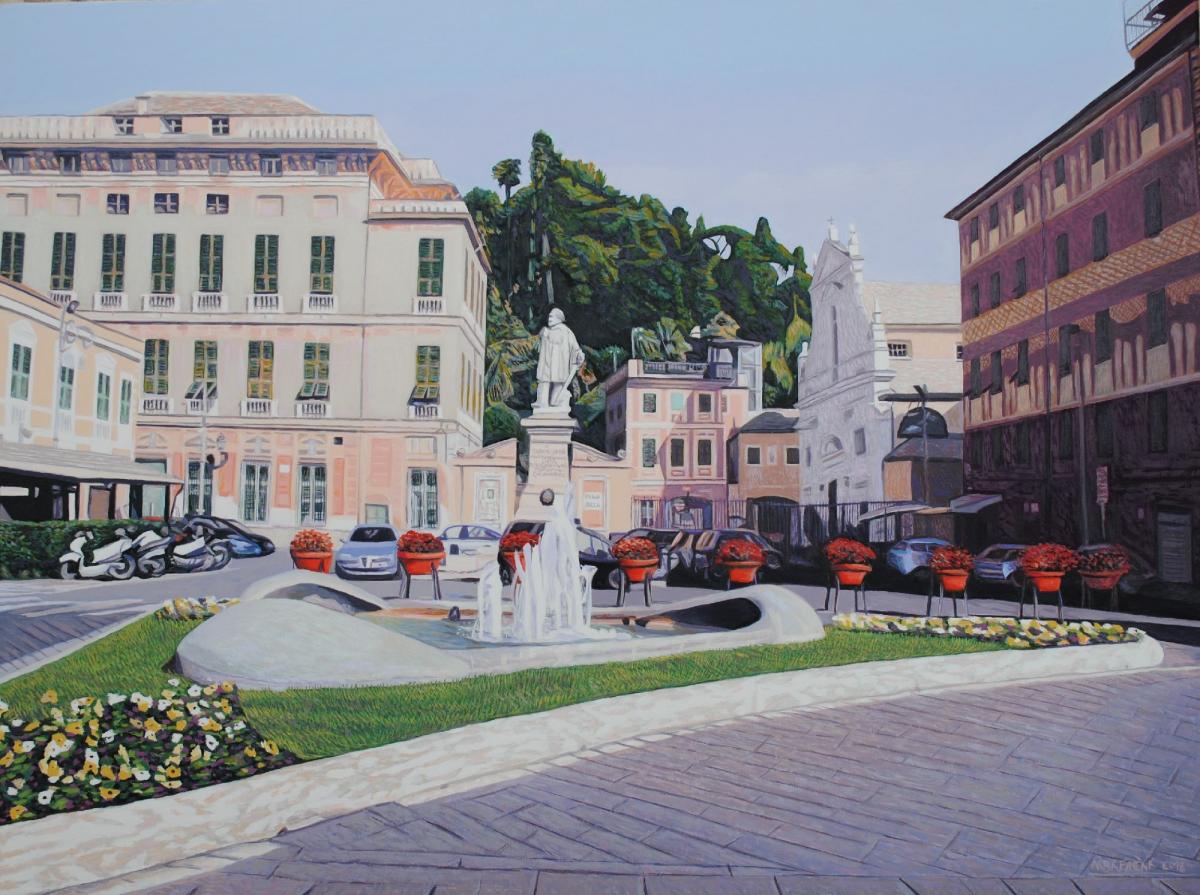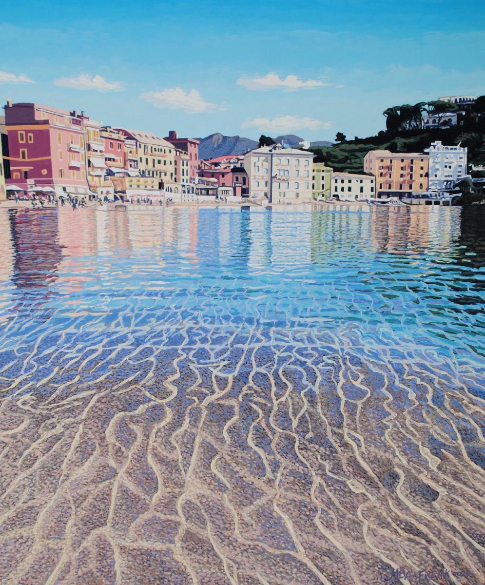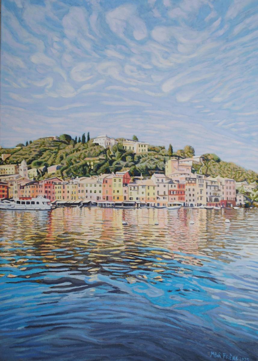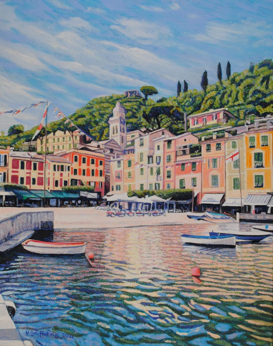 La tipica visione di Calata Marconi di Portofino, con i suoi colori delle facciate delle case che si riflettono nel mare con pennellate di colori vari che si sovrappongono tra loro.