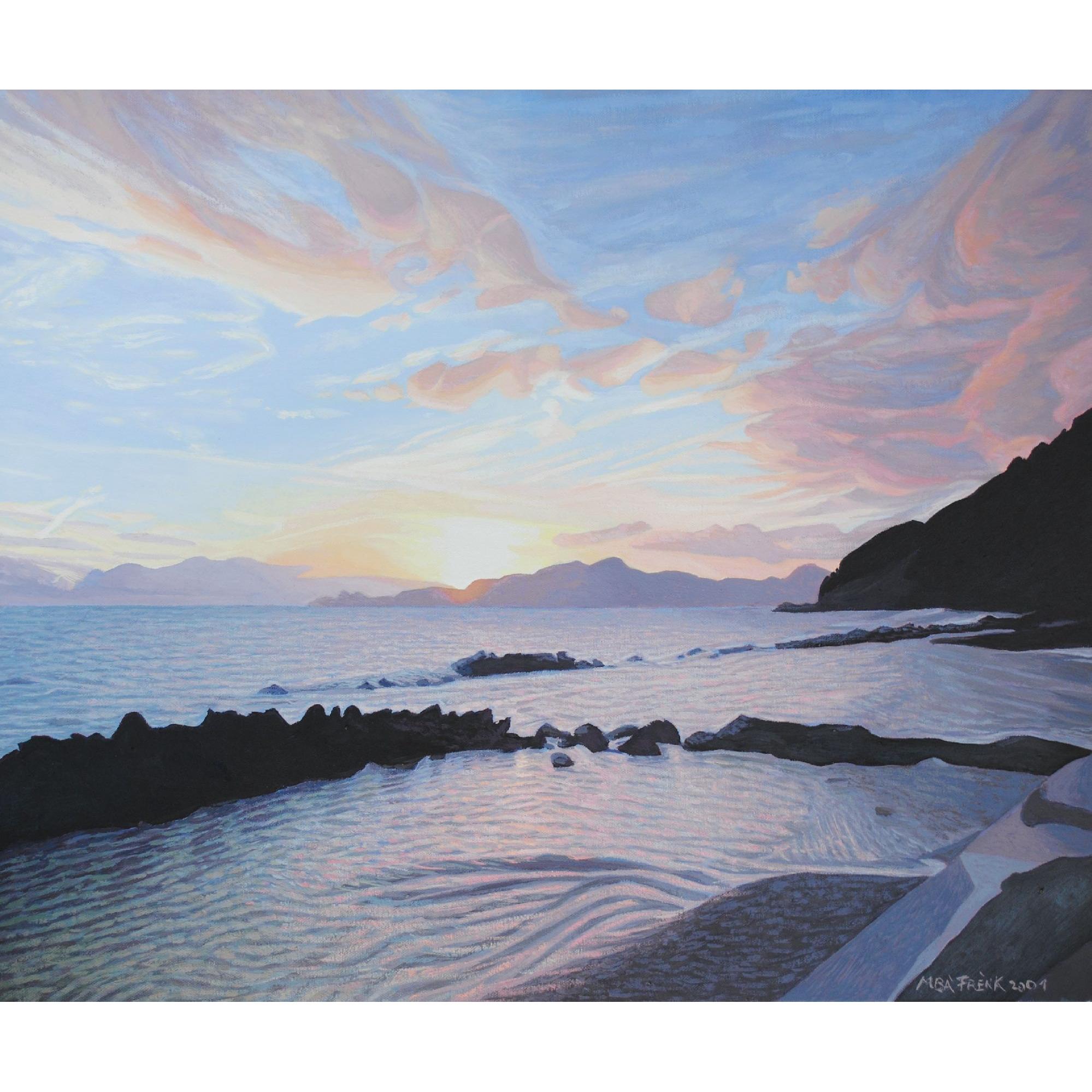 Tramonto con tonalita' lilla sul Tigullio che si riflettono sul mare che ondula con pennellate sapienti. In fondo si vede il monte di Portofino.