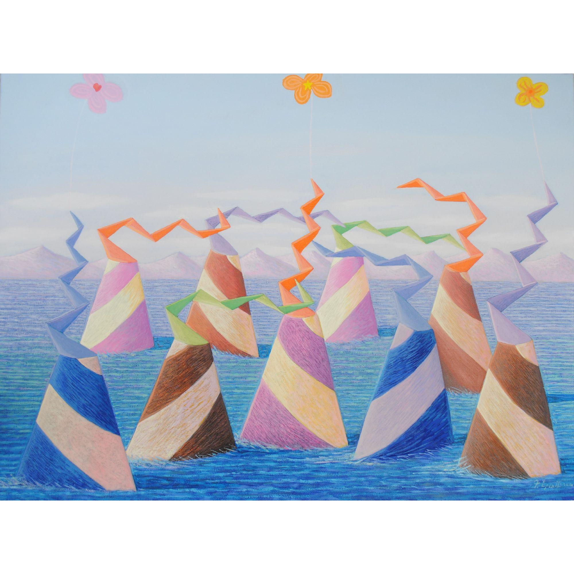 L'opera rappresenta delle forme coniche simboliche, che sostituiscono le persone, immerse in un ambiente alluvionato dall'acqua ,che e' nella tematica del movimento dell'Ultima Generazione.