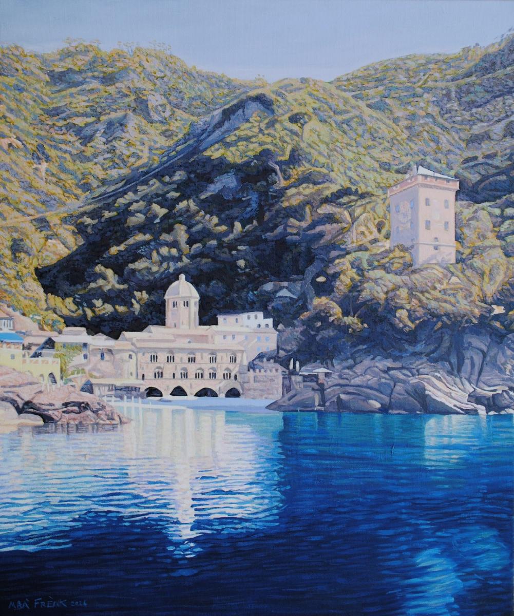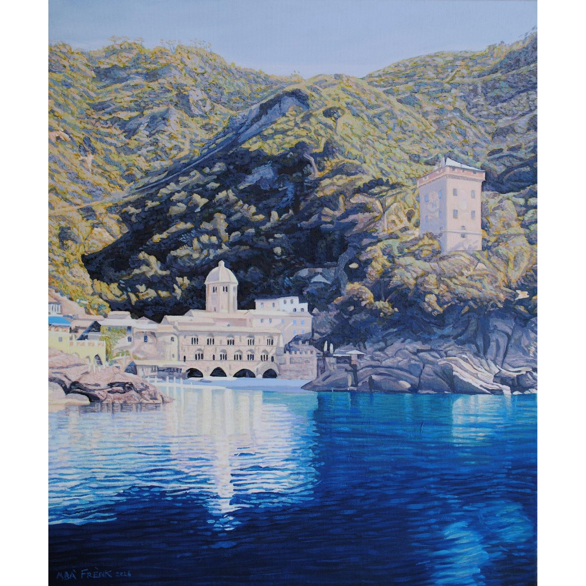 L'opera rappresenta l'abazia di Sanfruttuoso di Camogli, vista dal battello e illuminata dal sole. Il mare di colore blu di Prussia con gradazione che si schiariscono verso la luce, ed il monte con la sua vegetazione tipica di macchia mediterranea della Liguria.