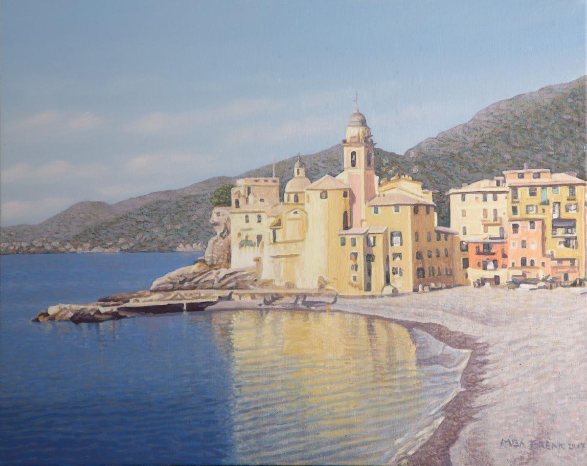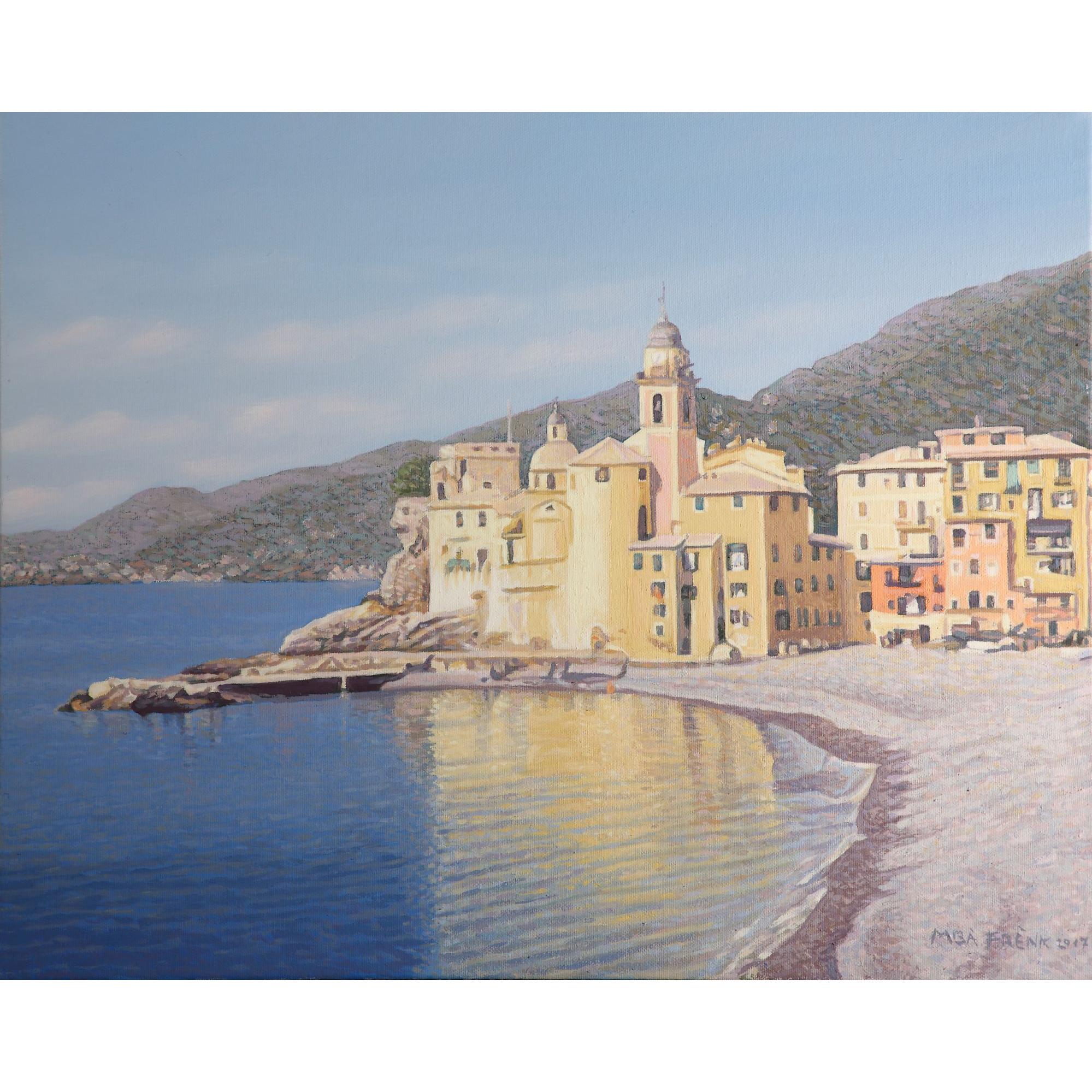 L'opera rappresenta un panorama di Camogli-(GE), con la sua caratteristica chiesa che si riflette nel mare .La giornata e' tersa e luminosa come le tonalità dei colori.