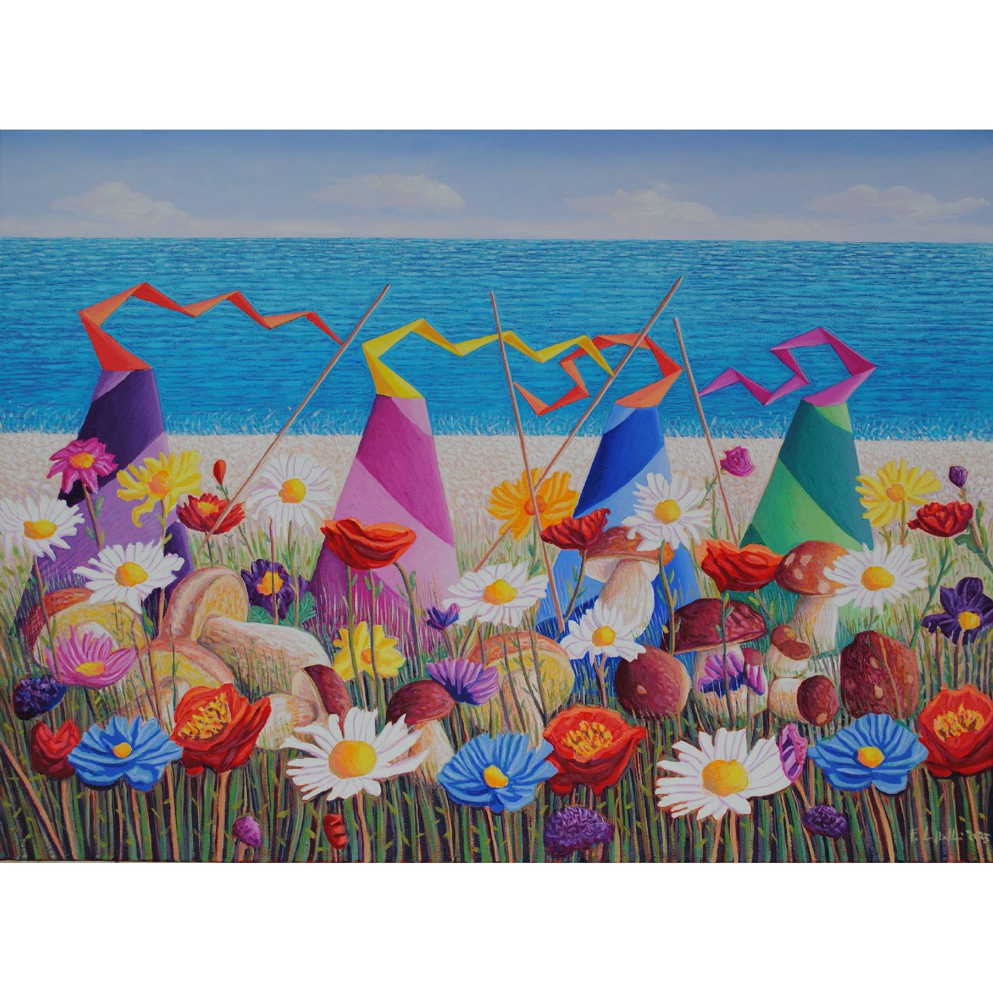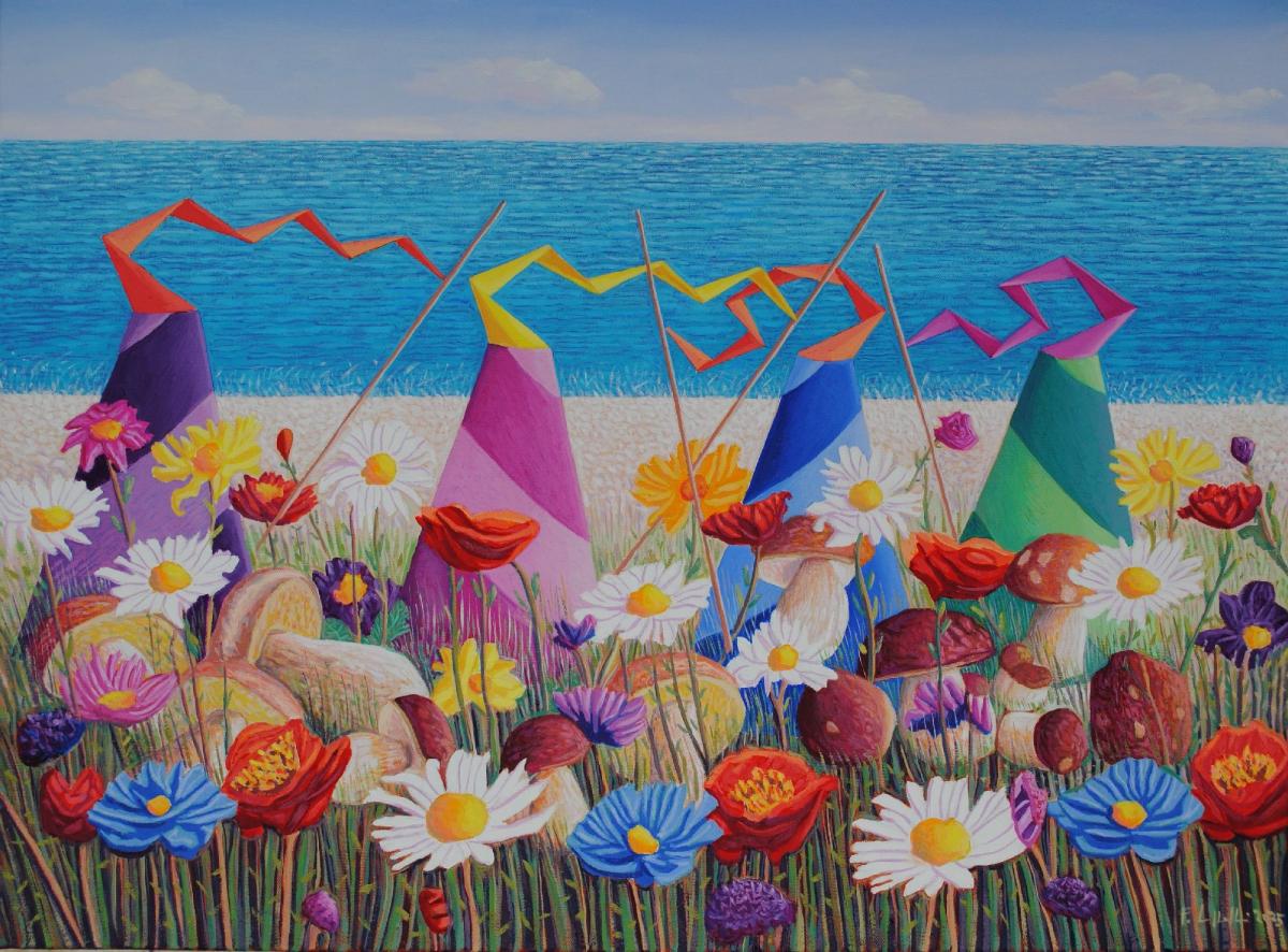 L'opera rappresenta della forme simboliche che cercano dei funghi tra una vegetazione fiorita in una bella giornata di sole.