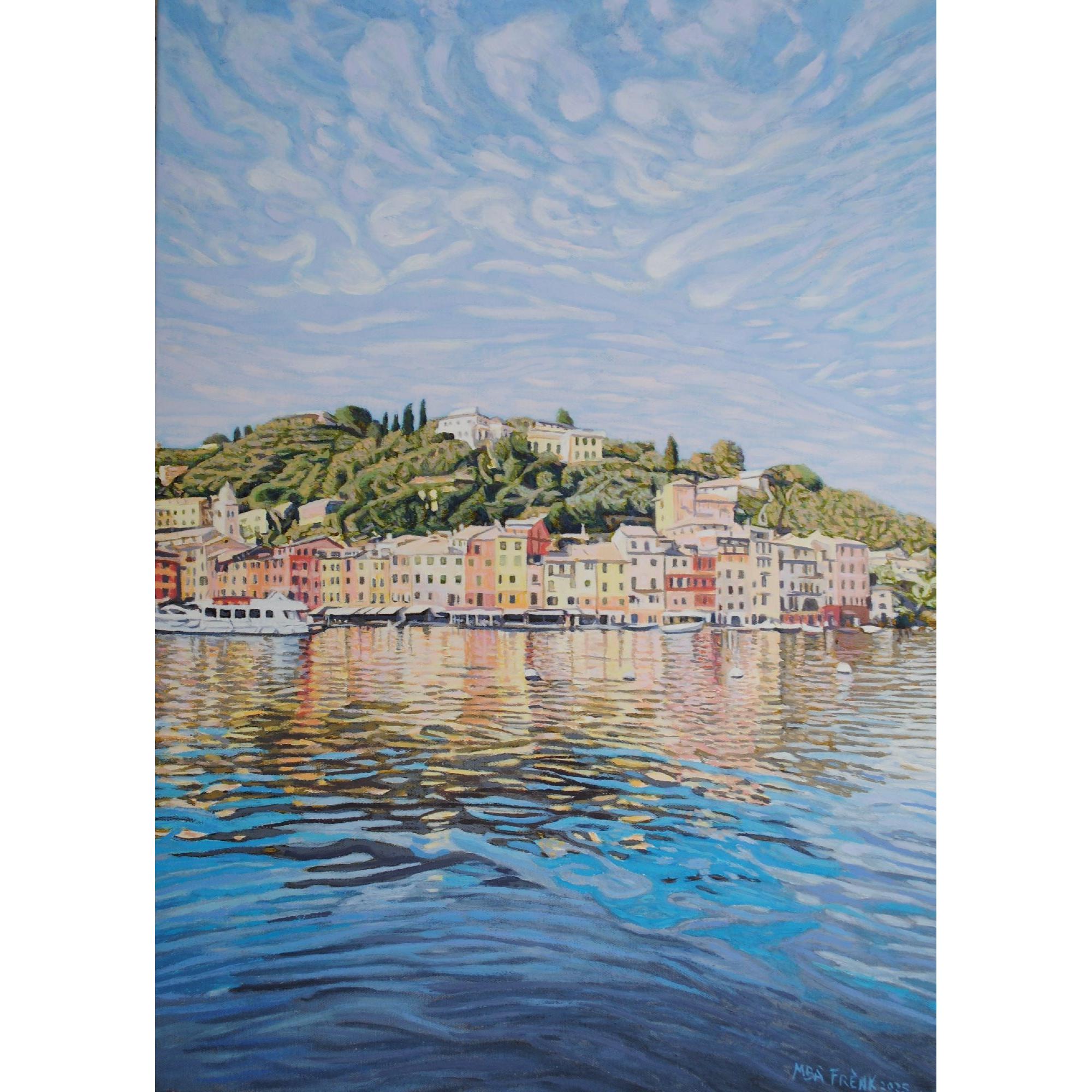 L'opera rappresenta Portofino vista del mare in una bella giornata di sole che illumina il borgo e riflette le case nel mare, di pennellate di colori che si sovrappongono.