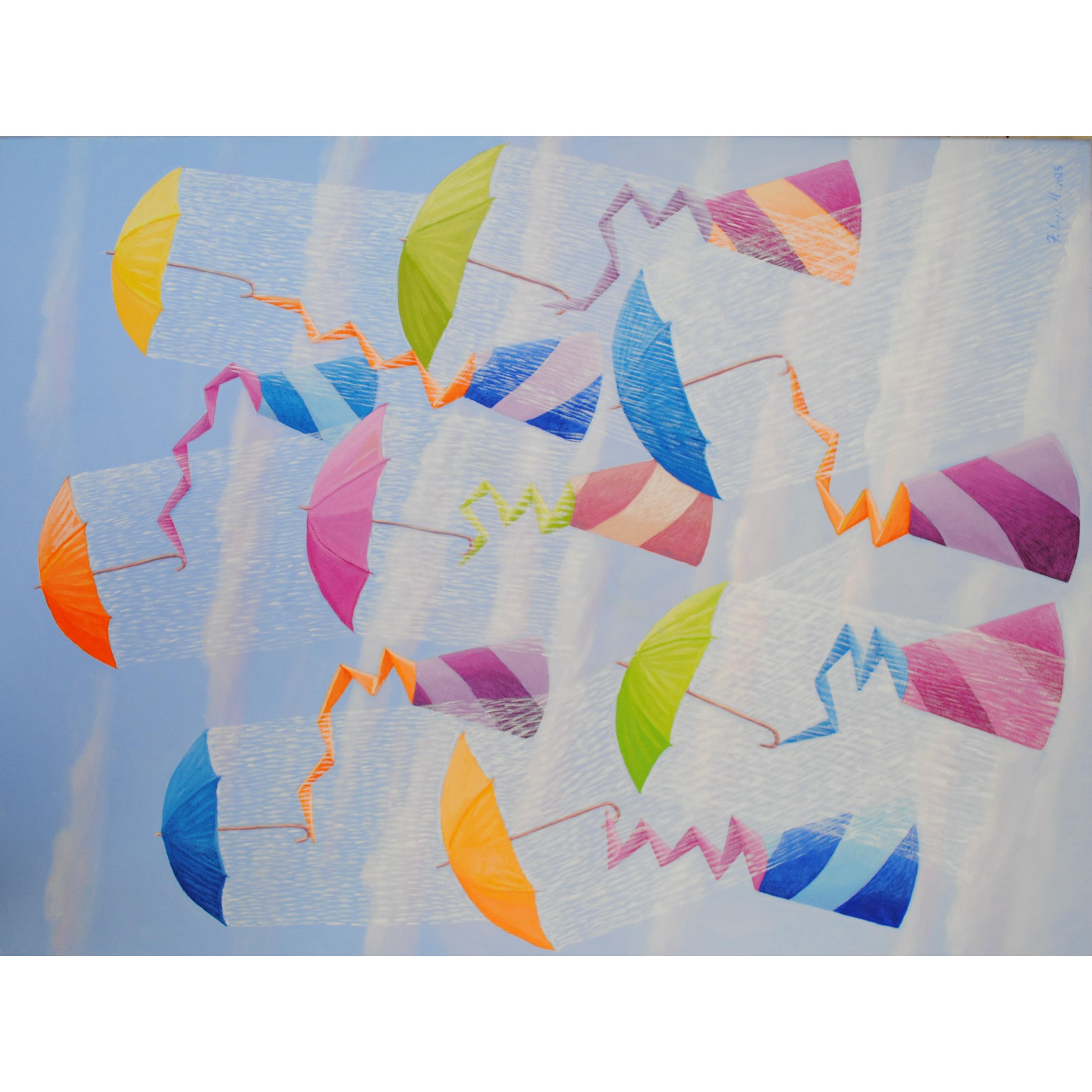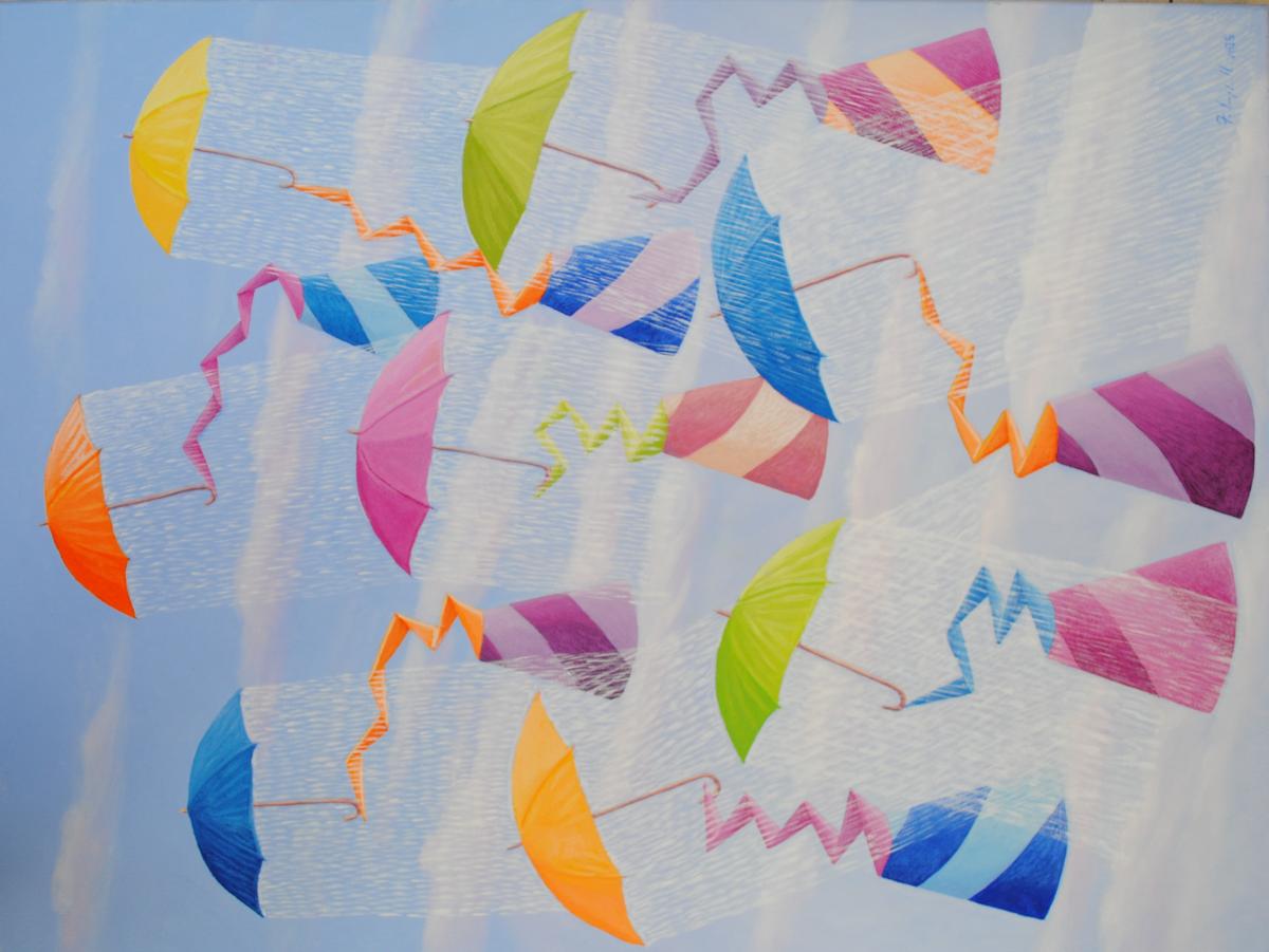 L'opera rappresenta delle forme coniche simboliche che volano verso l'alto con degli ombrelli che emanano pioggia . Opera colorata con tinte pastello che trasmette un messaggio di serenità.